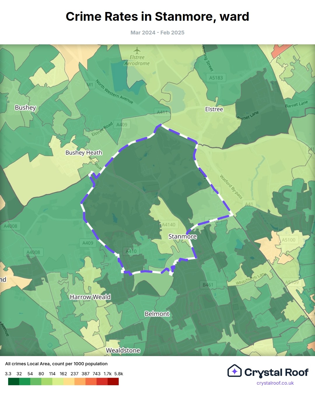 Stanmore (ward) is located within Harrow (borough). Annual total crime rate in Harrow (borough) is 83.3 crimes per thousand resident population, which can be rated as 3 out of 10 or low crime level compared to other local authority districts in England and Wales.