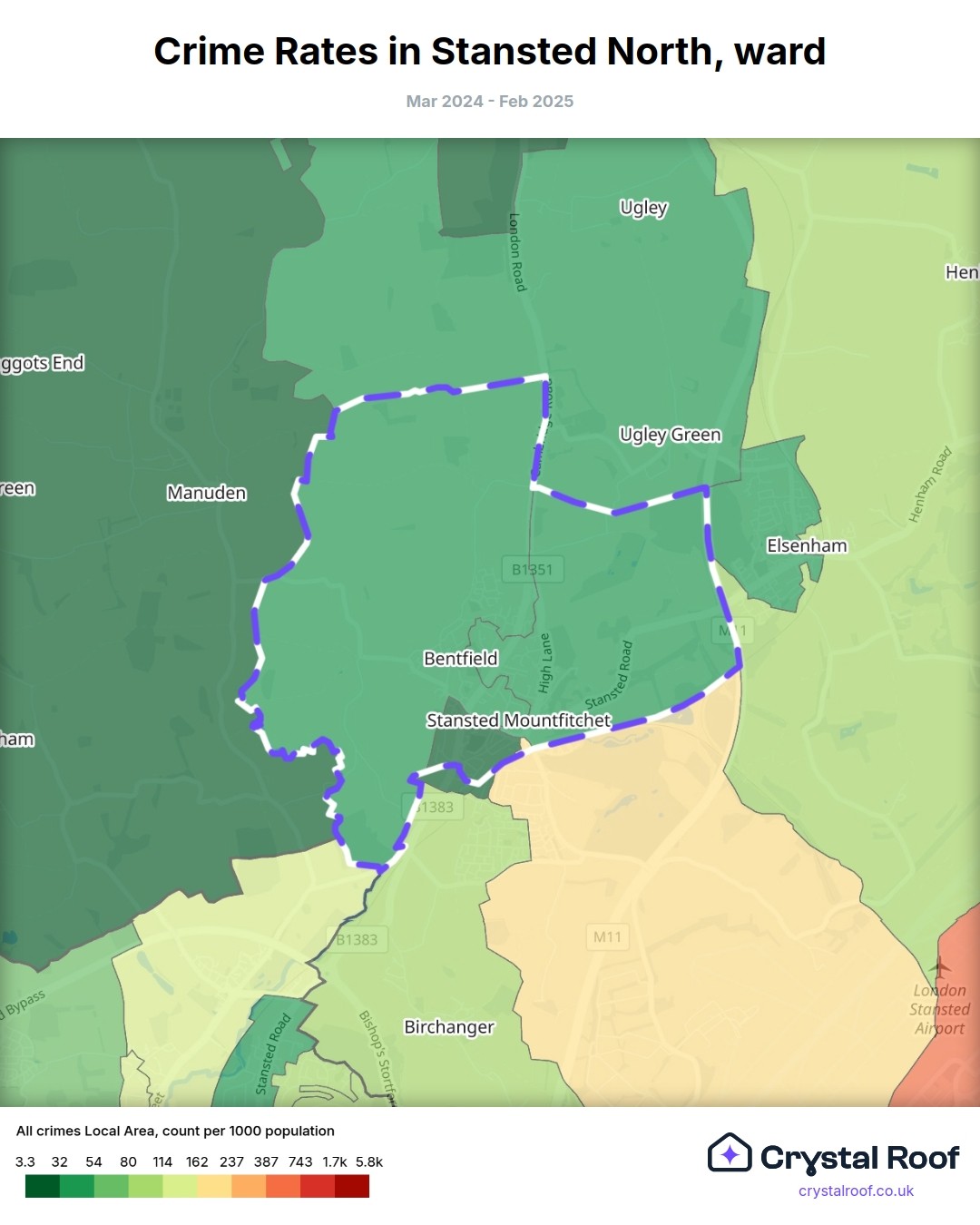 Stansted North, (ward) includes areas with the following crime ratings (see map):