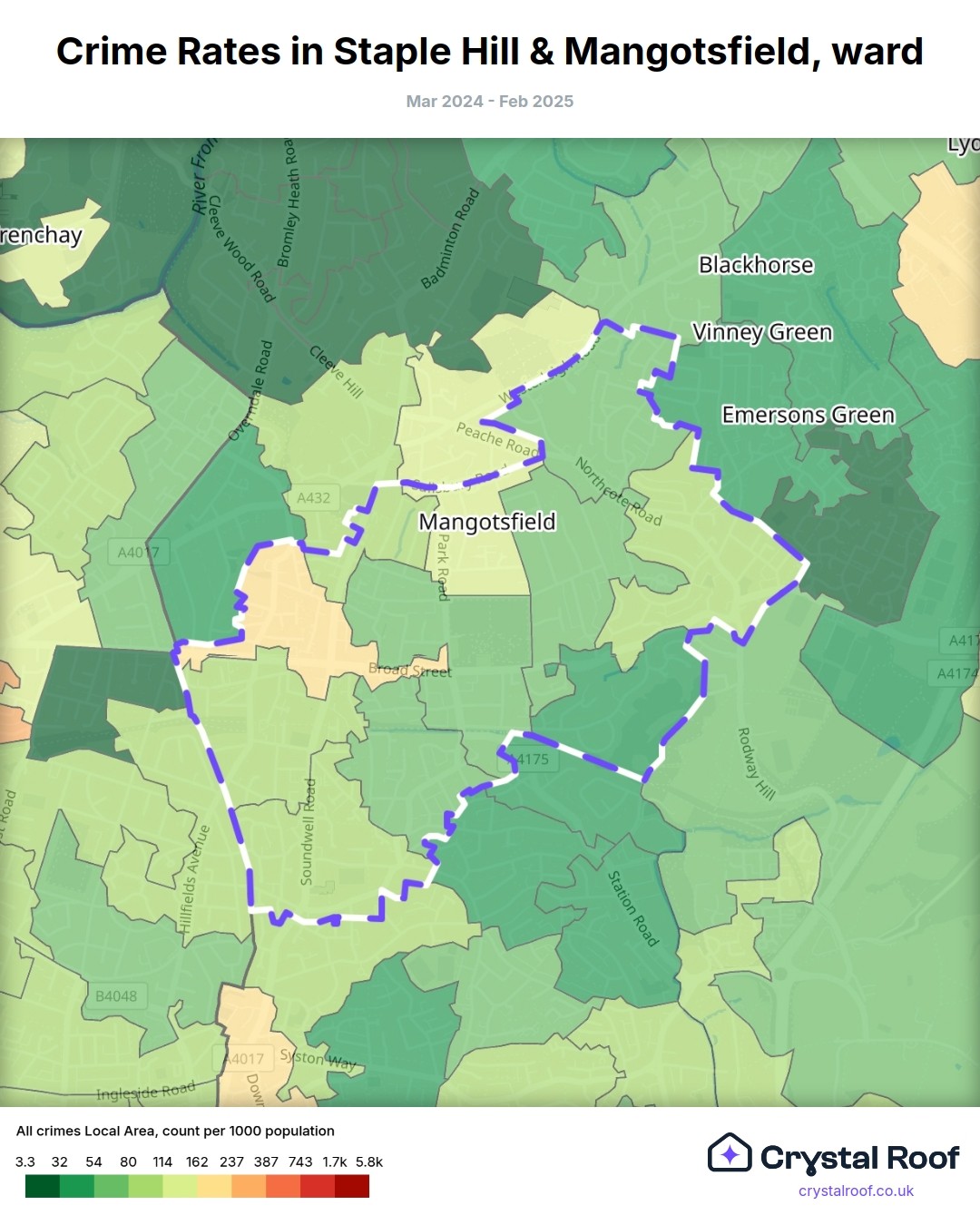 Staple Hill & Mangotsfield, (ward) includes areas with the following crime ratings (see map):