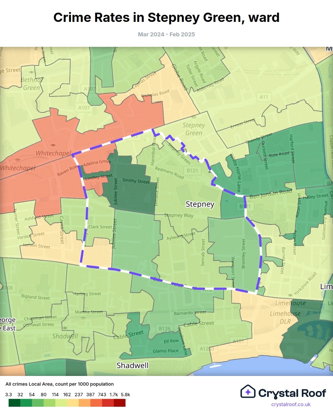 The figures in grey indicate the relative ratings of Stepney Green (ward) for a specific crime type compared to other wards in England and Wales.