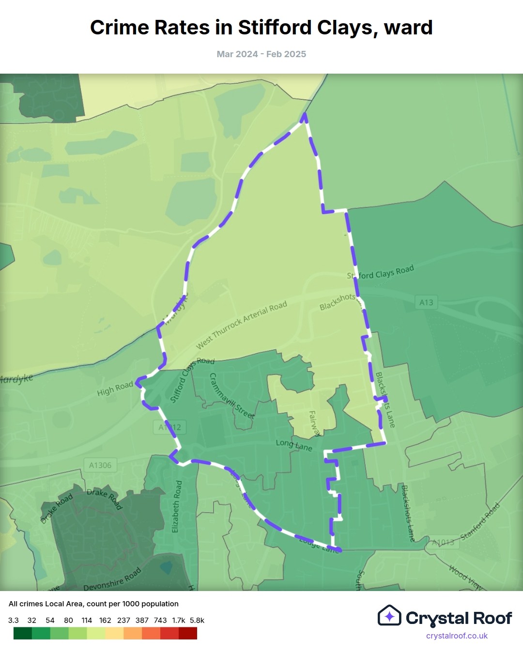 Stifford Clays, (ward) includes areas with the following crime ratings (see map):
