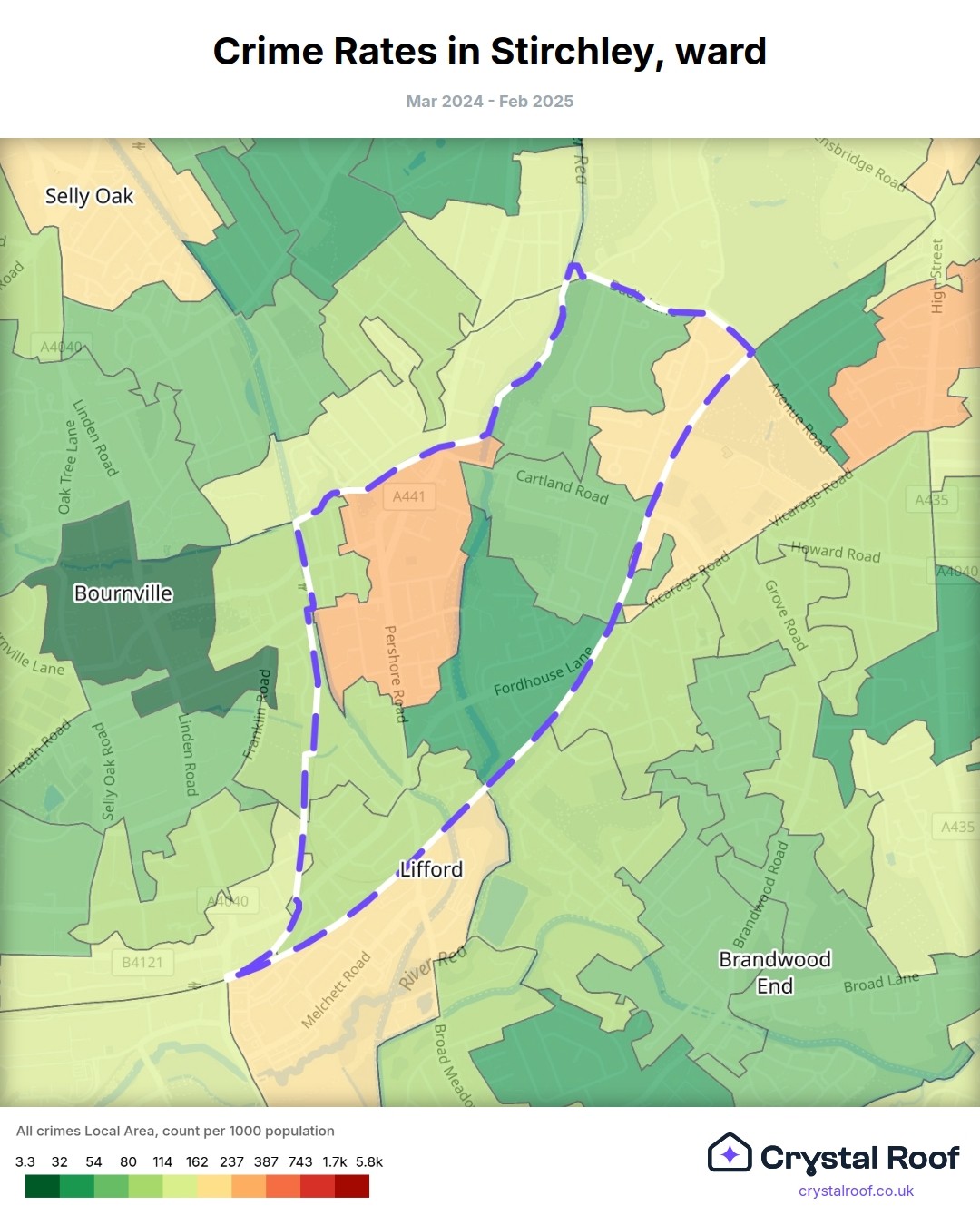 Stirchley, (ward) includes areas with the following crime ratings (see map):