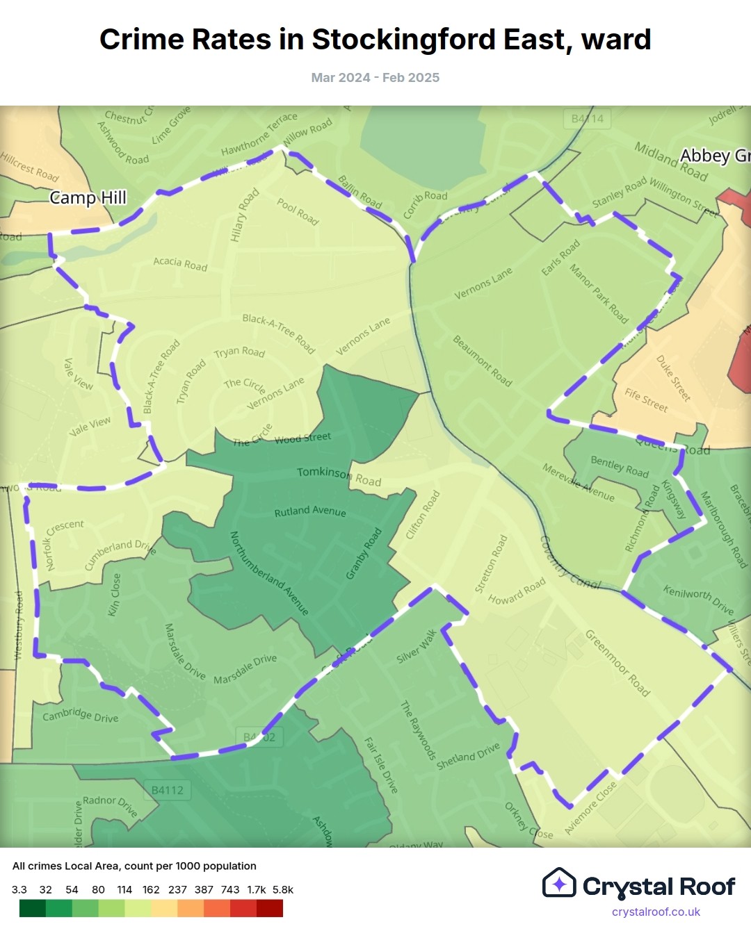 Stockingford East, (ward) includes areas with the following crime ratings (see map):