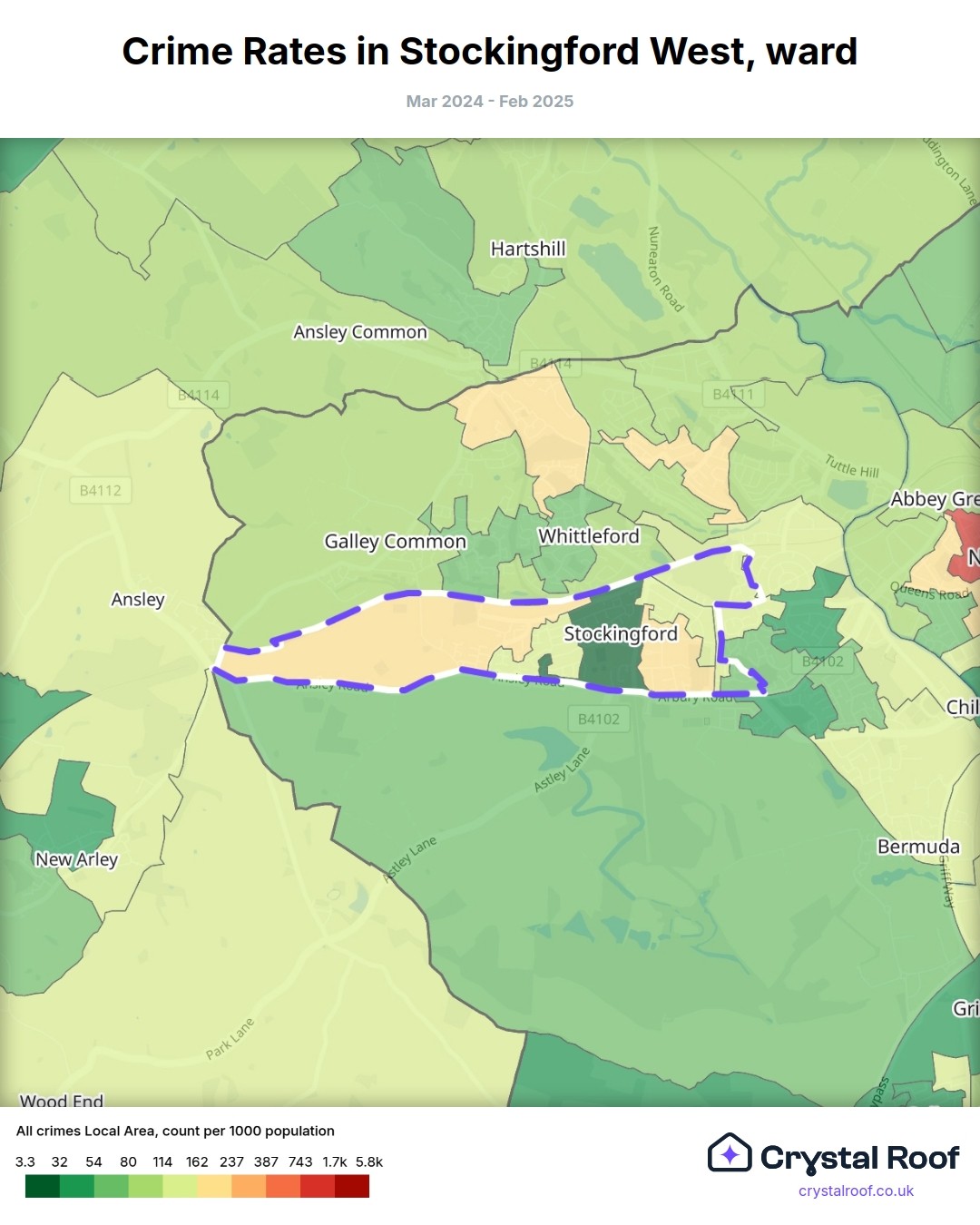 Stockingford West, (ward) includes areas with the following crime ratings (see map):