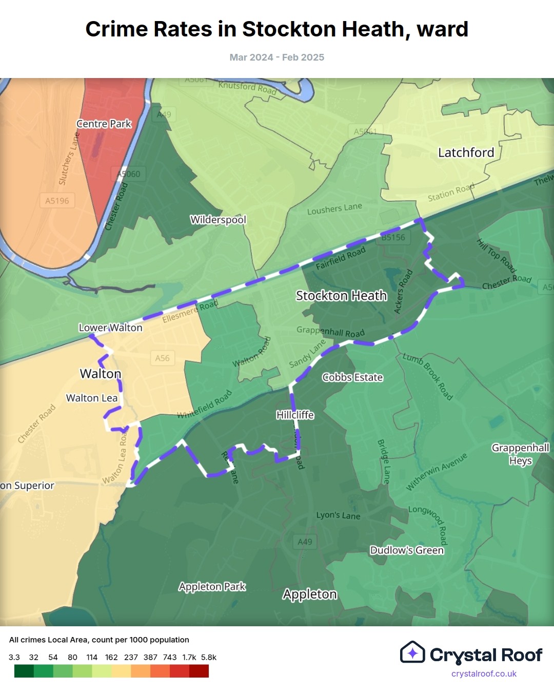 Stockton Heath, (ward) includes areas with the following crime ratings (see map):