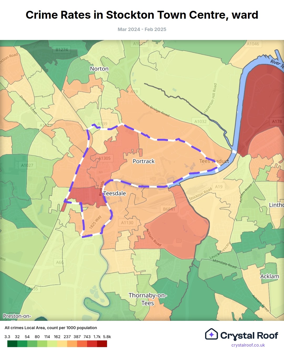 Stockton Town Centre, (ward) includes areas with the following crime ratings (see map):