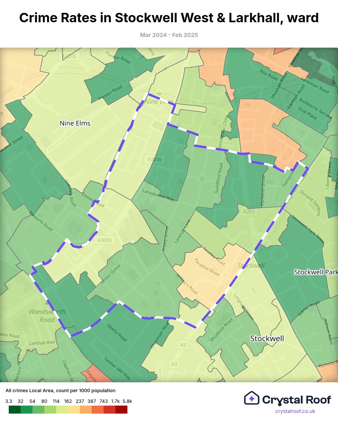 Stockwell West & Larkhall, (ward) includes areas with the following crime ratings (see map):