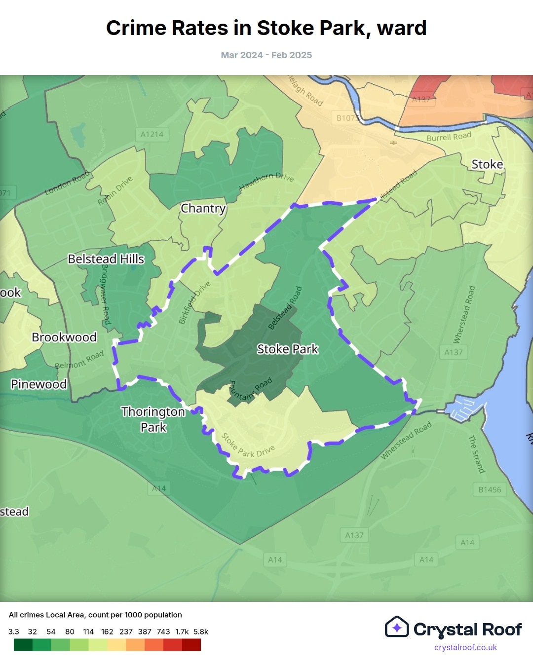 Stoke Park, (ward) includes areas with the following crime ratings (see map):