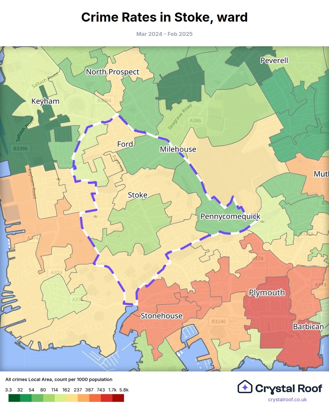 Stoke (ward) is located within Plymouth (borough). Annual total crime rate in Plymouth (borough) is 114 crimes per thousand resident population, which can be rated as 5 out of 10 or medium crime level compared to other local authority districts in England and Wales.
