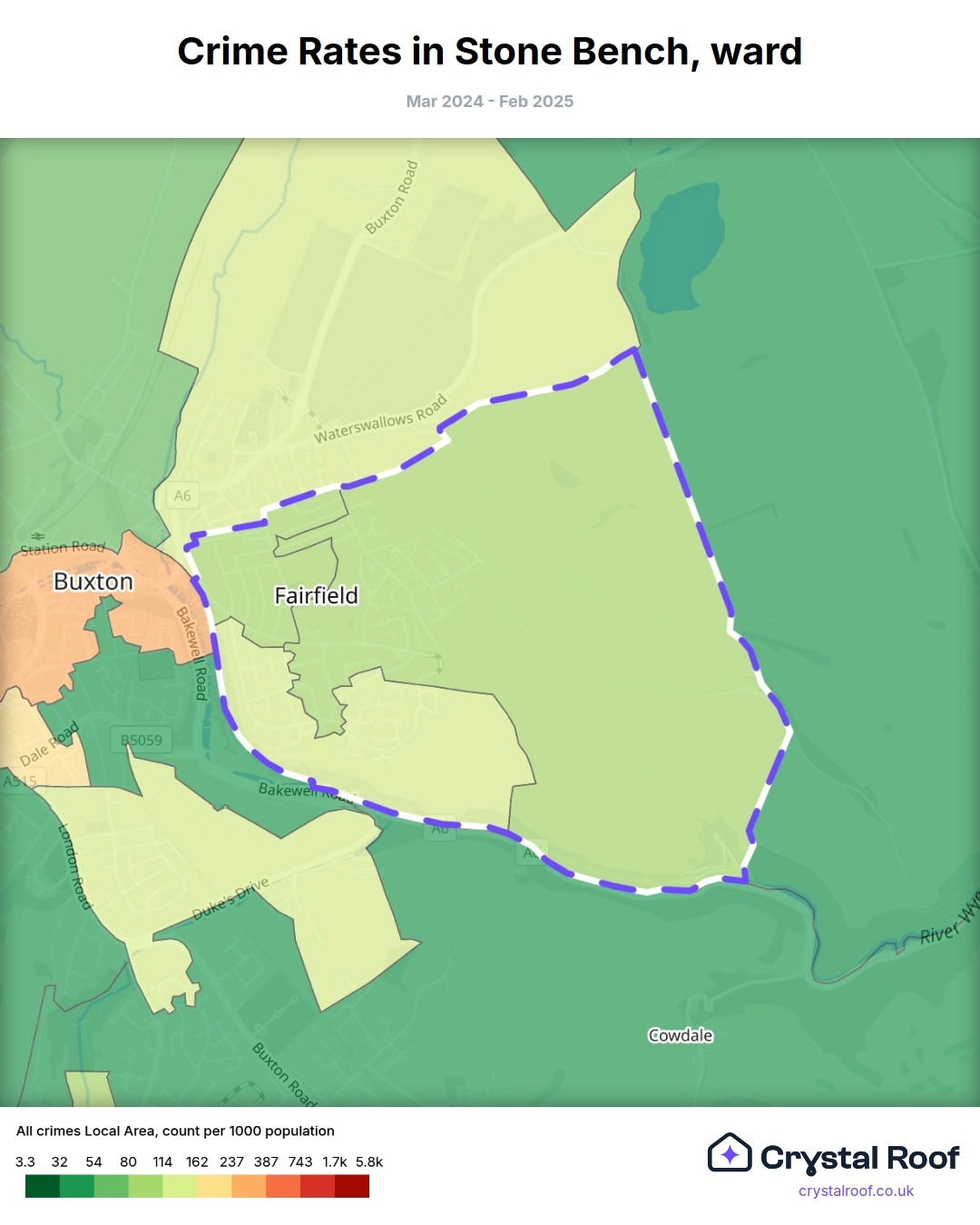 Stone Bench (ward) is located within High Peak (borough). Annual total crime rate in High Peak (borough) is 73.9 crimes per thousand resident population, which can be rated as 3 out of 10 or low crime level compared to other local authority districts in England and Wales.