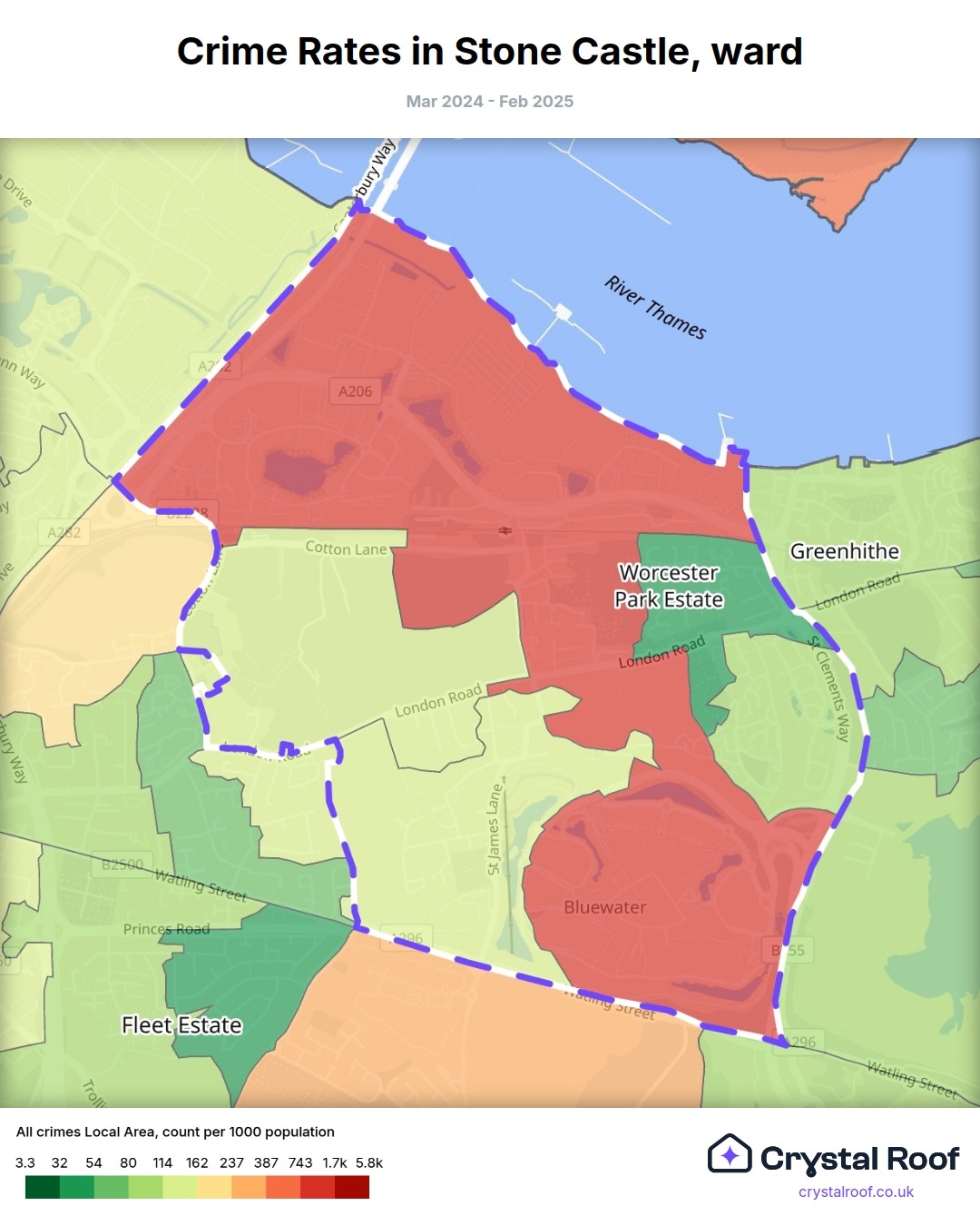 Stone Castle (ward) is located within Dartford (borough). Annual total crime rate in Dartford (borough) is 118 crimes per thousand resident population, which can be rated as 6 out of 10 or medium crime level compared to other local authority districts in England and Wales.