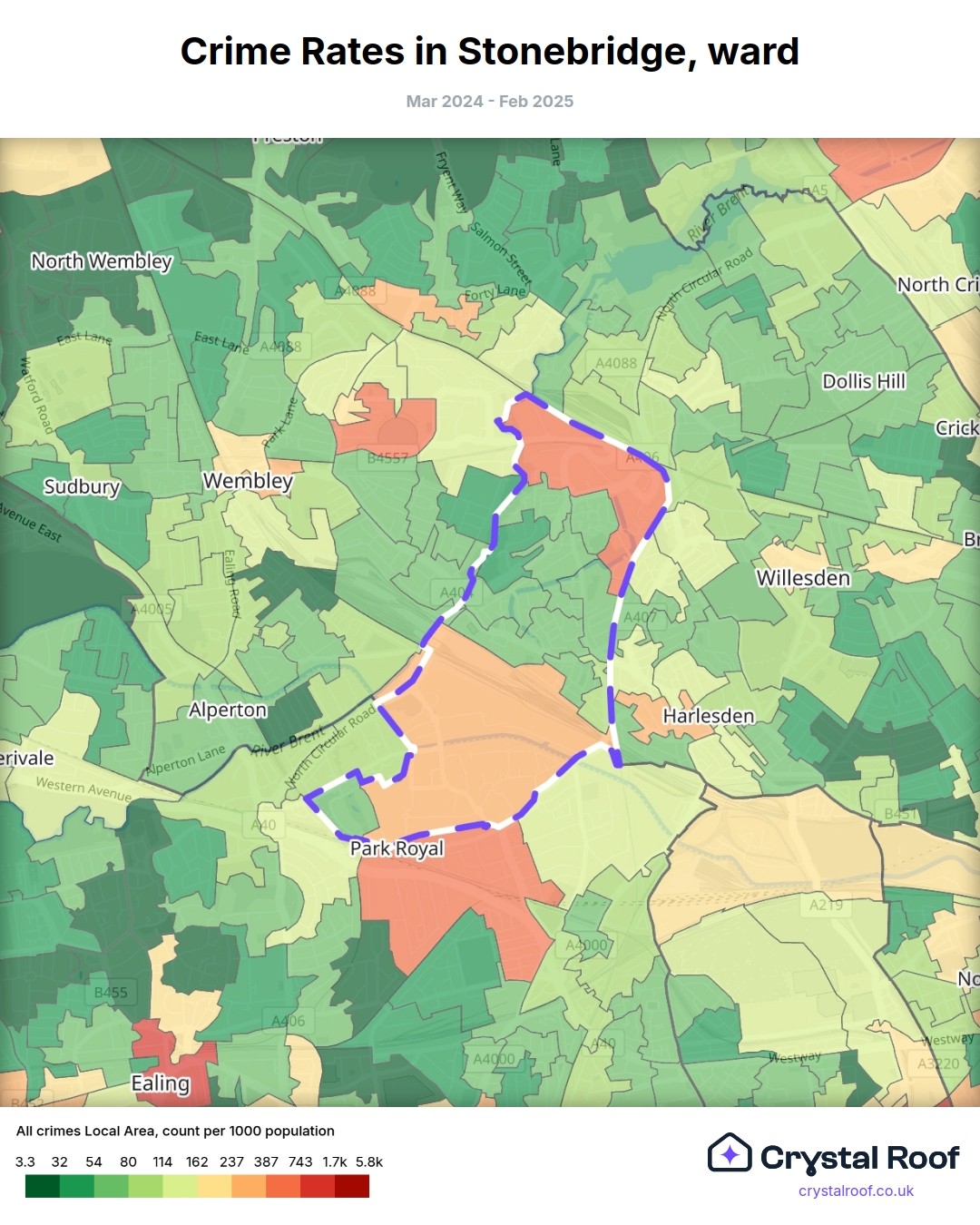 The figures in grey indicate the relative ratings of Stonebridge (ward) for a specific crime type compared to other wards in England and Wales.