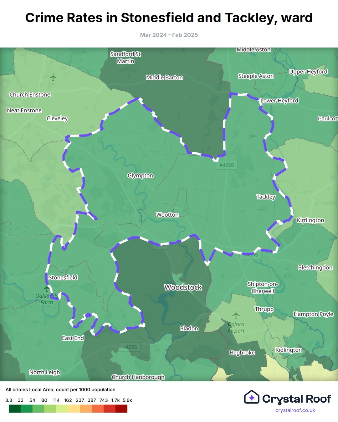 Stonesfield and Tackley, (ward) includes areas with the following crime ratings (see map):