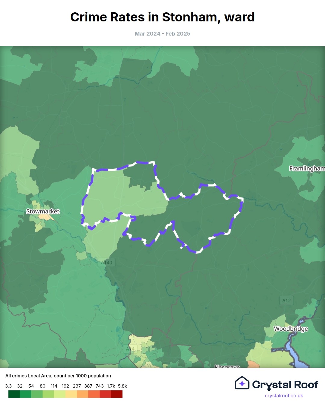 Stonham, (ward) includes areas with the following crime ratings (see map):