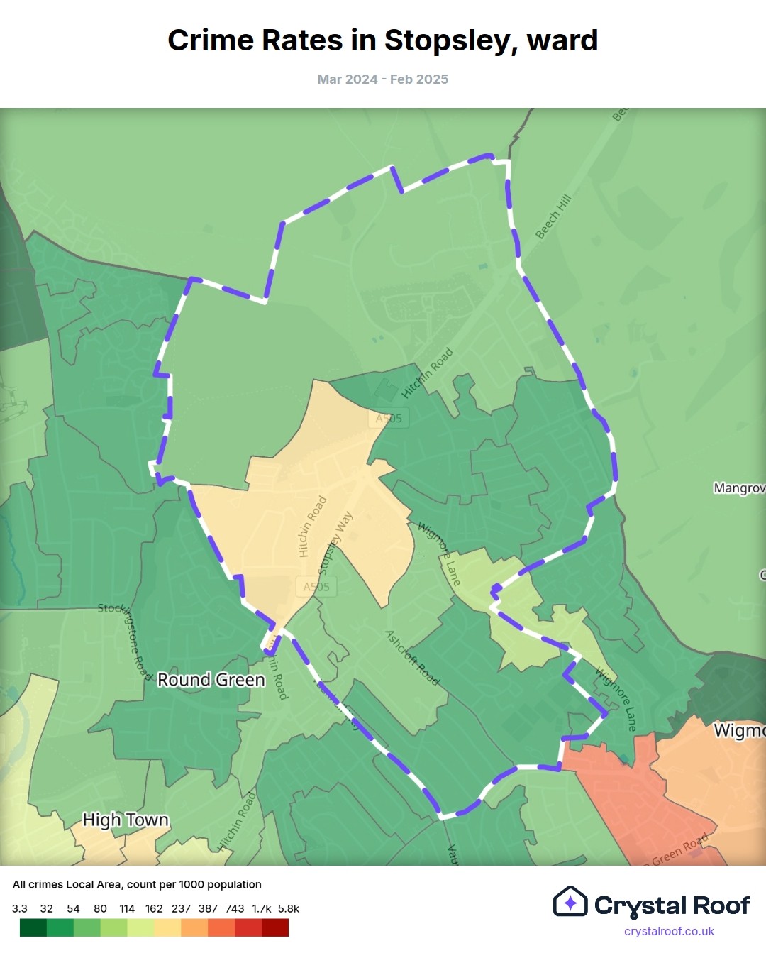 Stopsley, (ward) includes areas with the following crime ratings (see map):