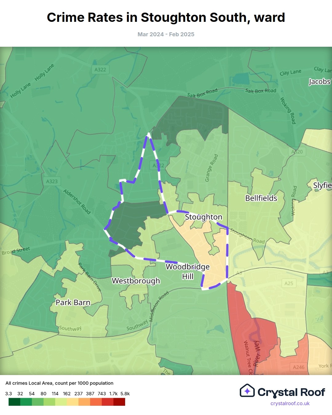 Stoughton South (ward) is located within Guildford (borough). Annual total crime rate in Guildford (borough) is 89.5 crimes per thousand resident population, which can be rated as 4 out of 10 or low crime level compared to other local authority districts in England and Wales.