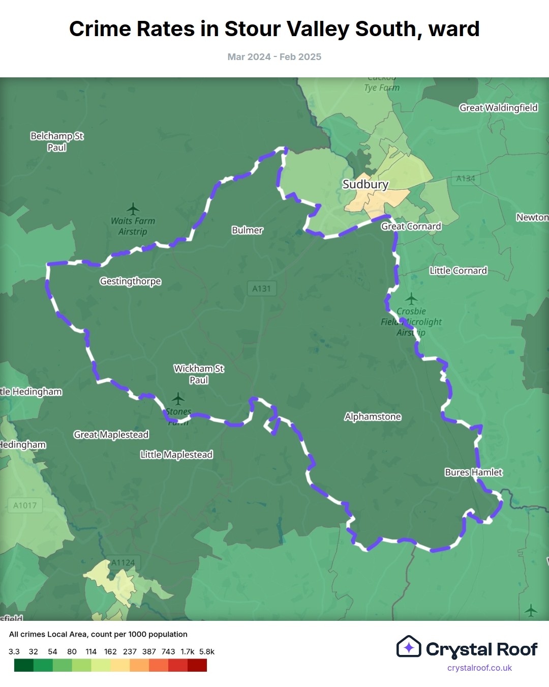 Stour Valley South, (ward) includes areas with the following crime ratings (see map):