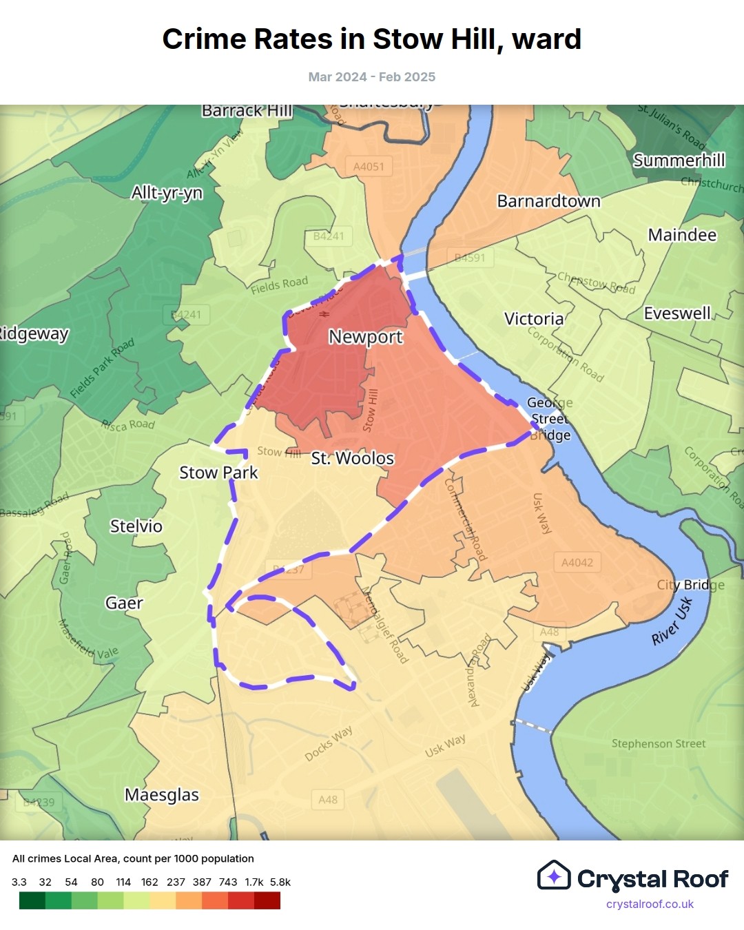 Stow Hill, (ward) includes areas with the following crime ratings (see map):