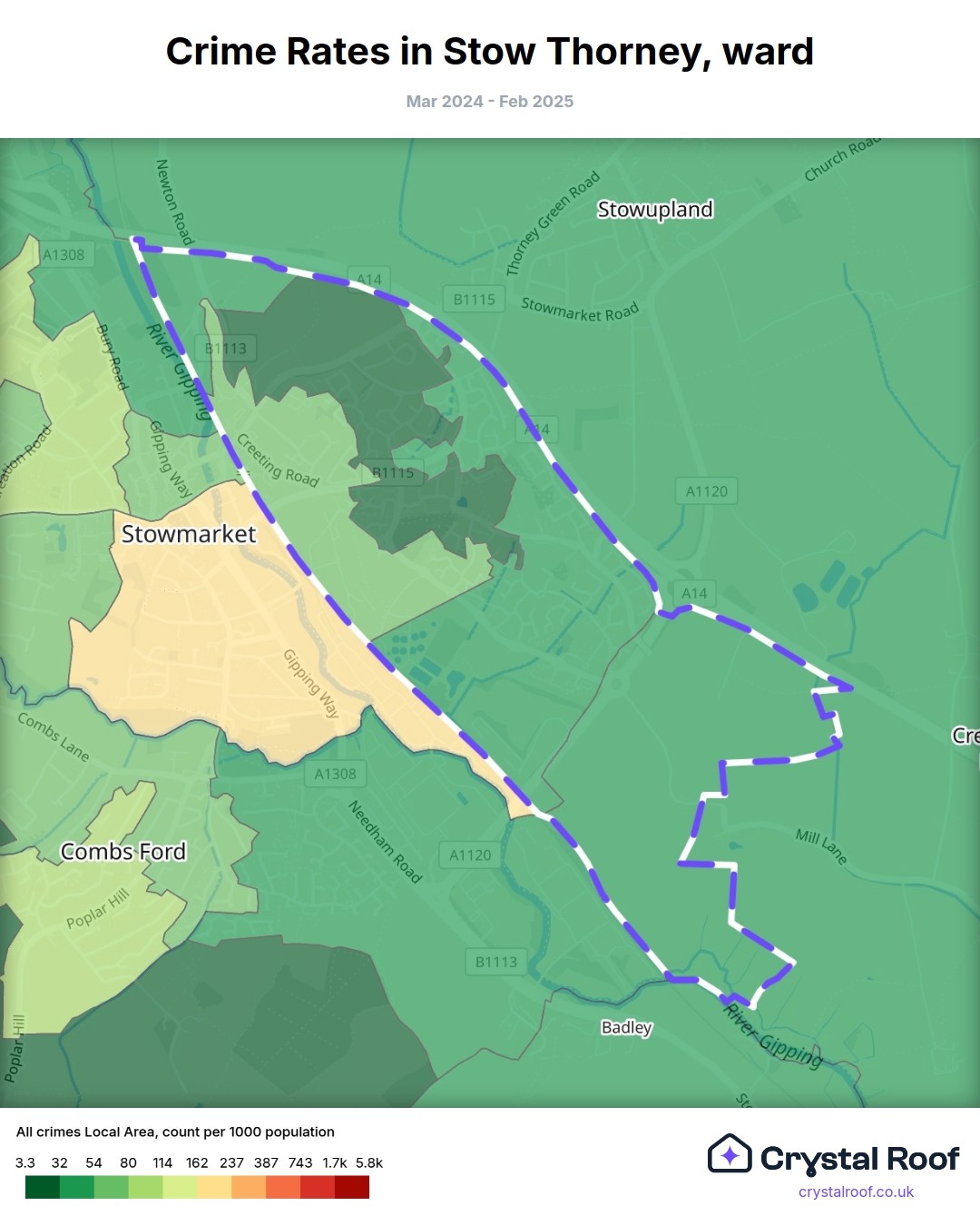 Stow Thorney (ward) is located within Mid Suffolk (borough). Annual total crime rate in Mid Suffolk (borough) is 42.4 crimes per thousand resident population, which can be rated as 1 out of 10 or low crime level compared to other local authority districts in England and Wales.