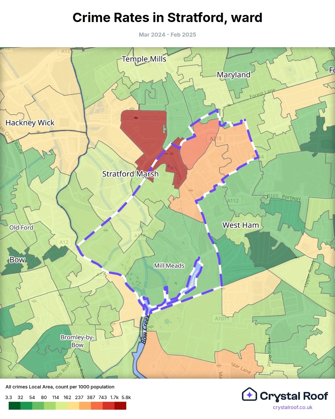 Stratford, (ward) includes areas with the following crime ratings (see map):