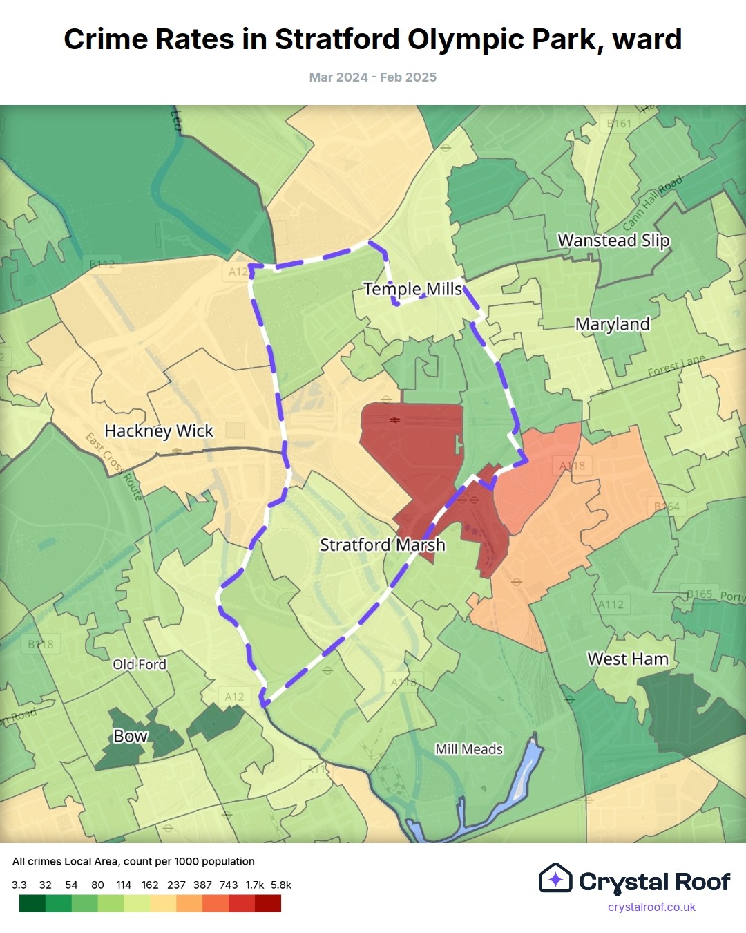 Stratford Olympic Park, (ward) includes areas with the following crime ratings (see map):