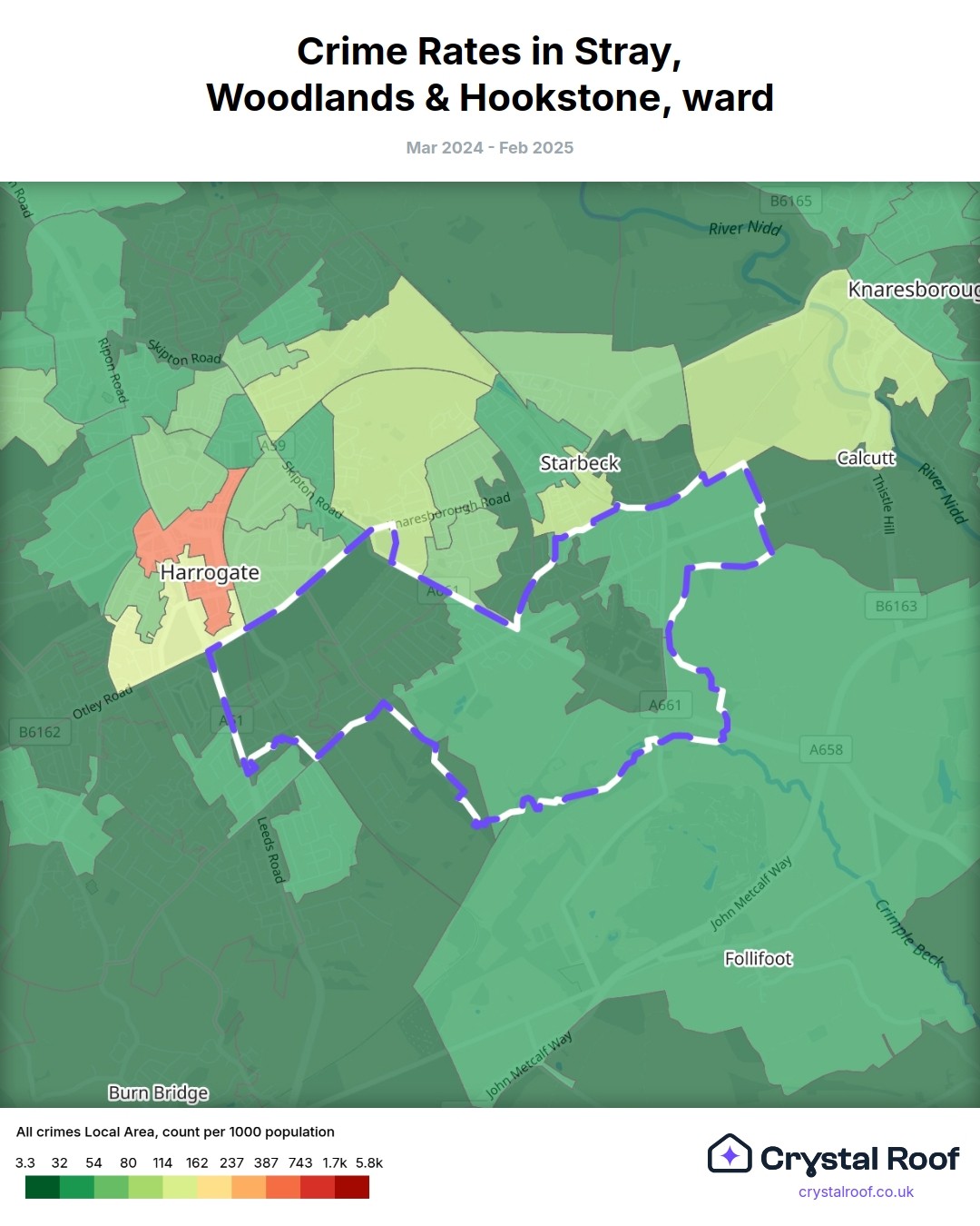 The figures in grey indicate the relative ratings of Stray, Woodlands & Hookstone (ward) for a specific crime type compared to other wards in England and Wales.