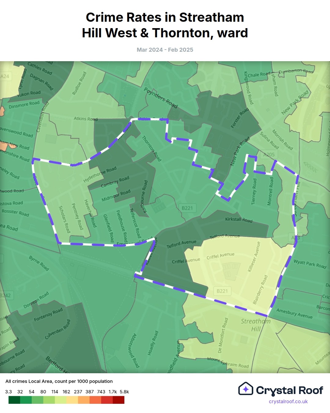 Streatham Hill West & Thornton, (ward) includes areas with the following crime ratings (see map):