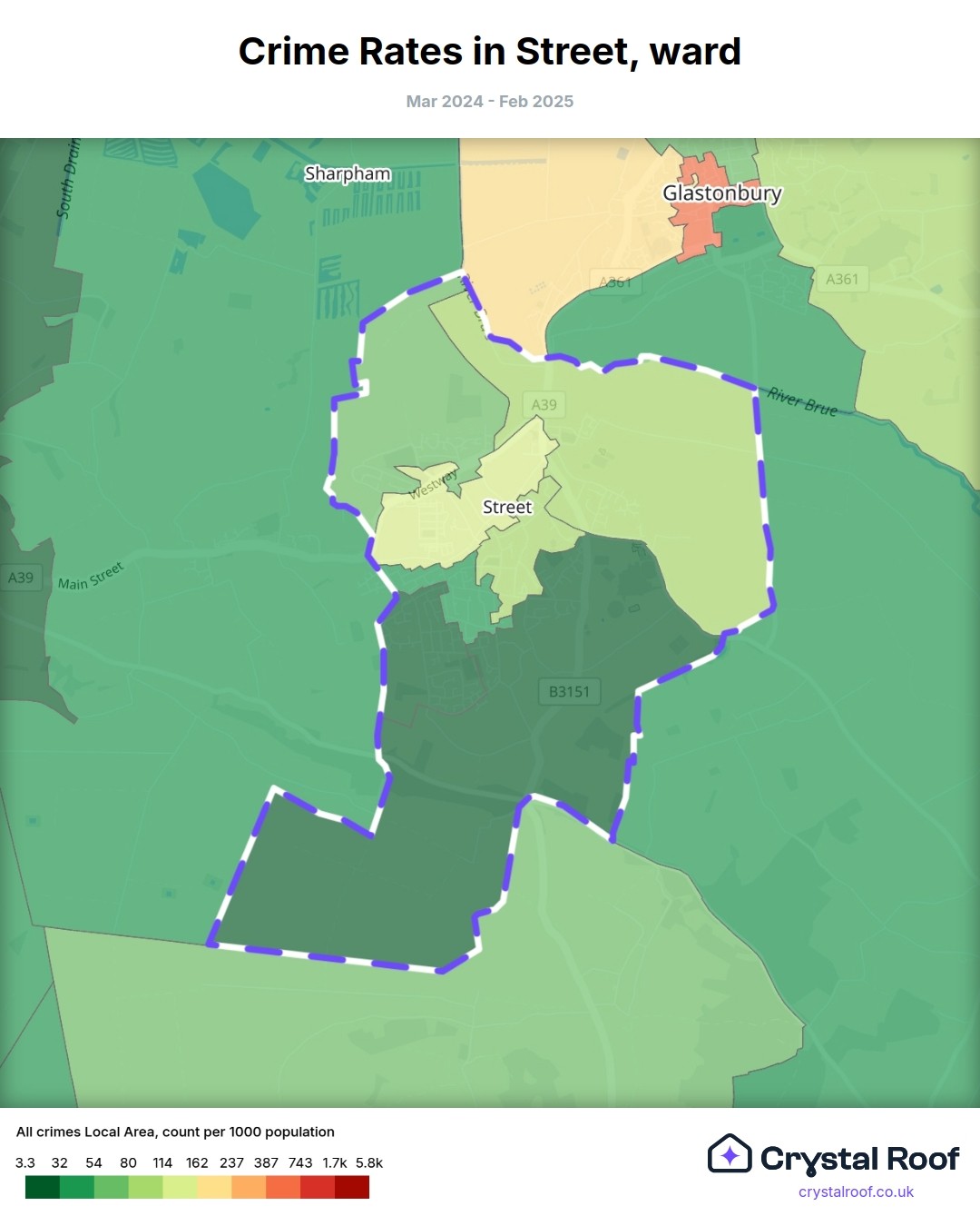 Annual total crime rate in Street (ward) is 64.4 per thousand resident population. This can be rated as 3 out of 10 or low crime level compared to other wards in England and Wales.