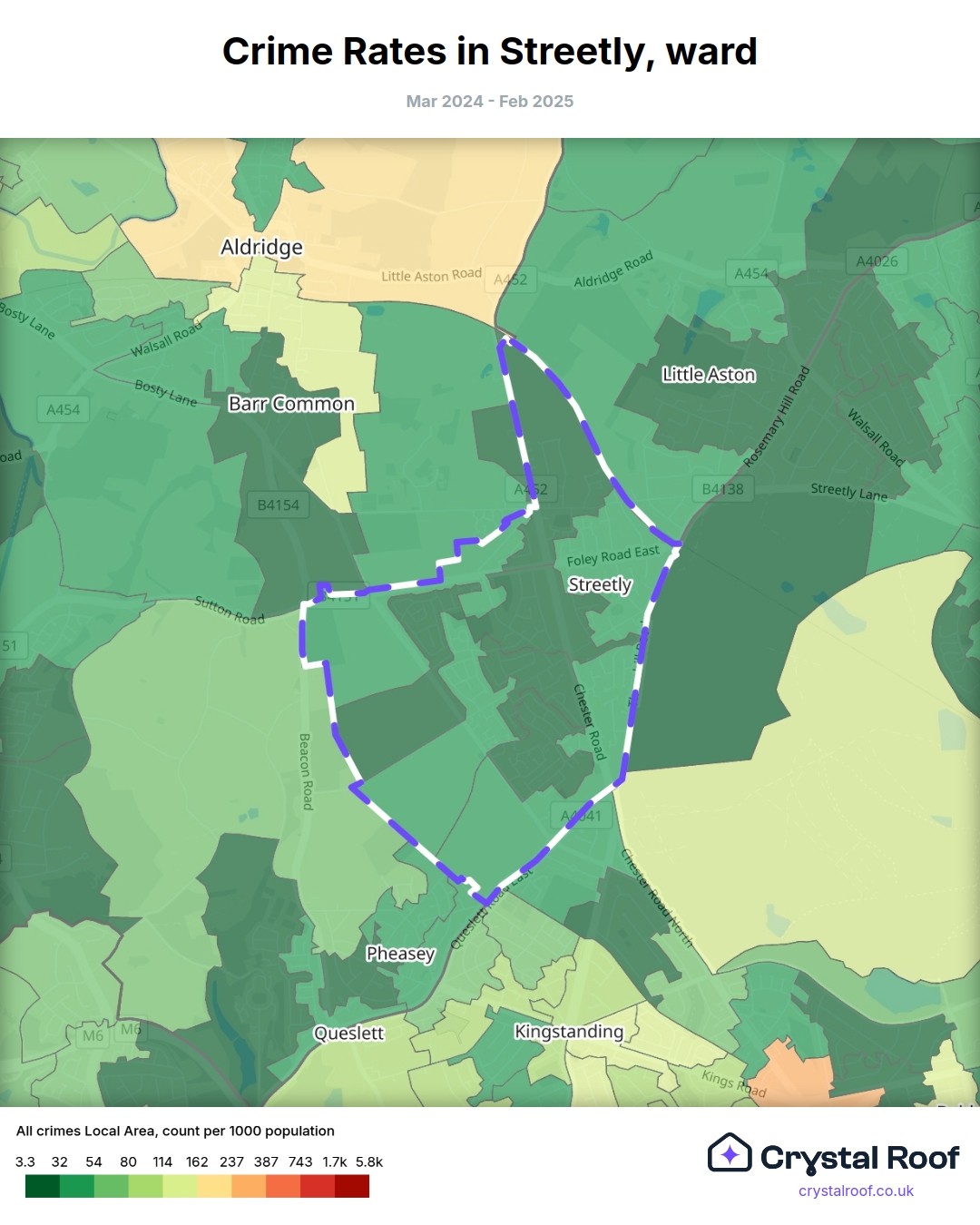 The figures in grey indicate the relative ratings of Streetly (ward) for a specific crime type compared to other wards in England and Wales.