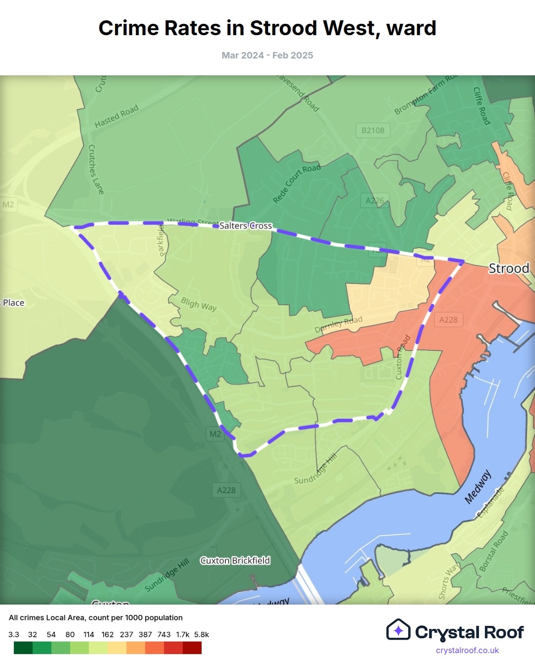 The figures in grey indicate the relative ratings of Strood West (ward) for a specific crime type compared to other wards in England and Wales.