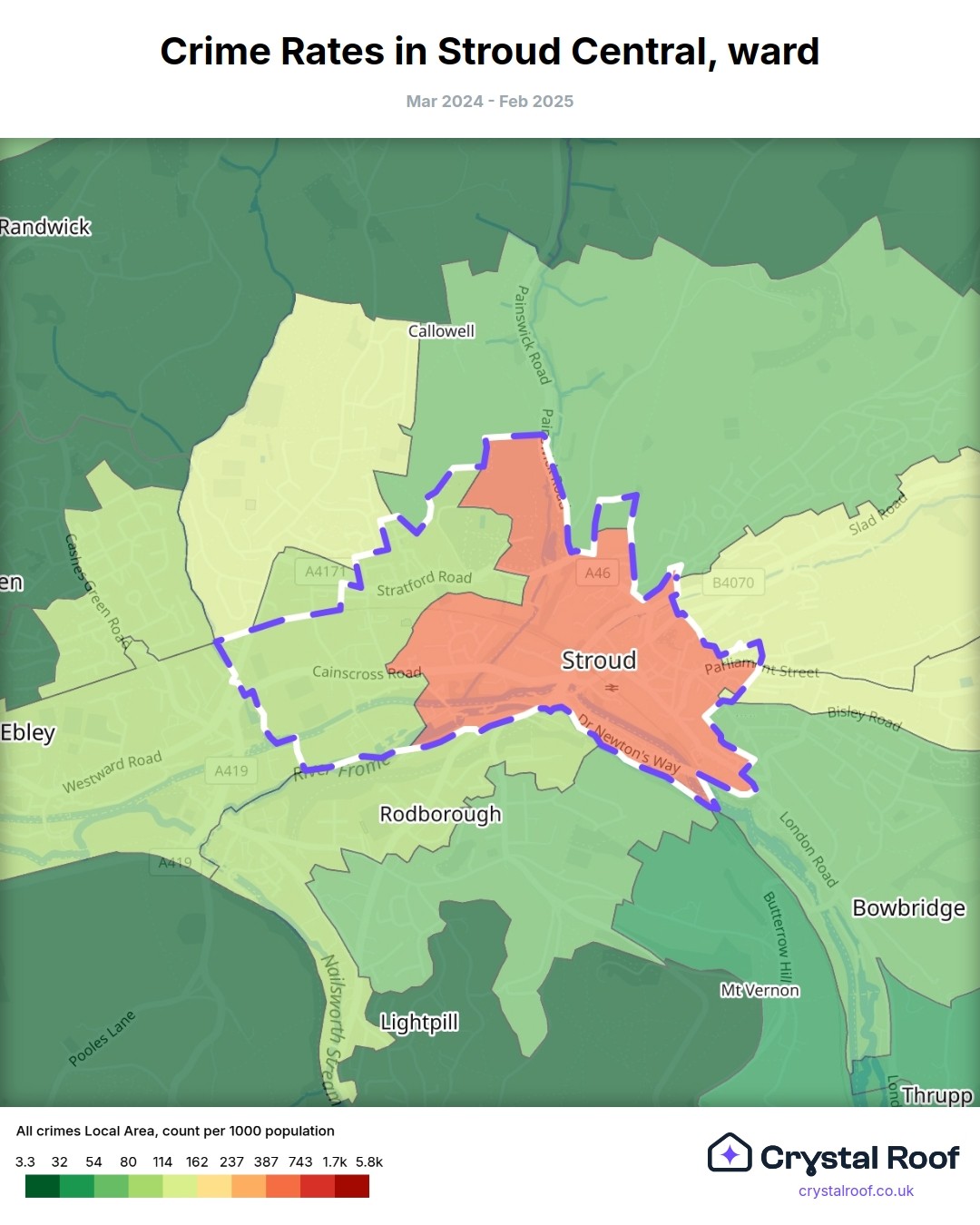 Stroud Central, (ward) includes areas with the following crime ratings (see map):