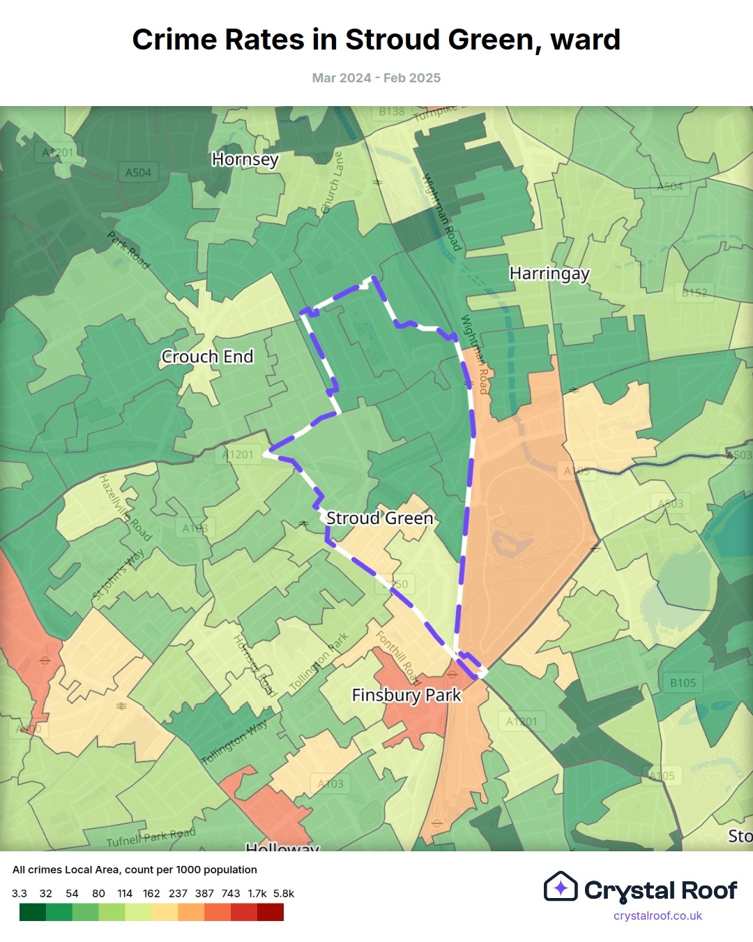 The figures in grey indicate the relative ratings of Stroud Green (ward) for a specific crime type compared to other wards in England and Wales.