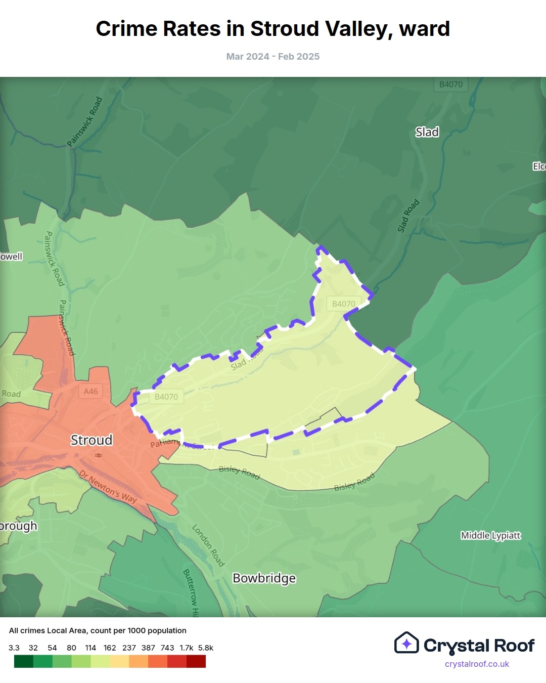 Stroud Valley, (ward) includes areas with the following crime ratings (see map):