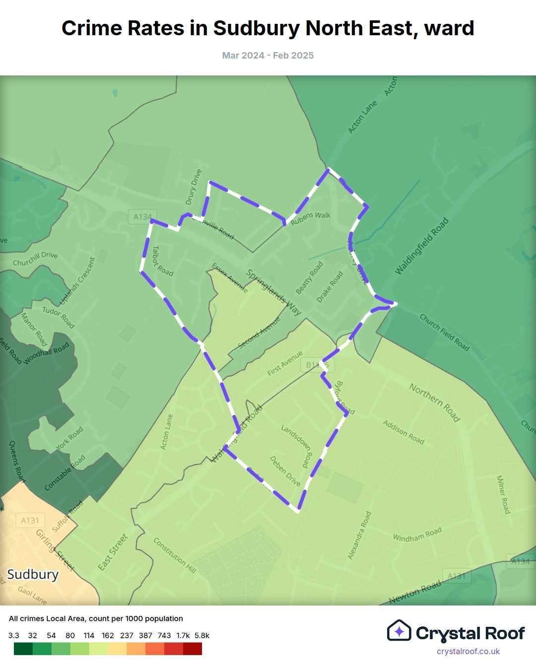 Sudbury North East, (ward) includes areas with the following crime ratings (see map):