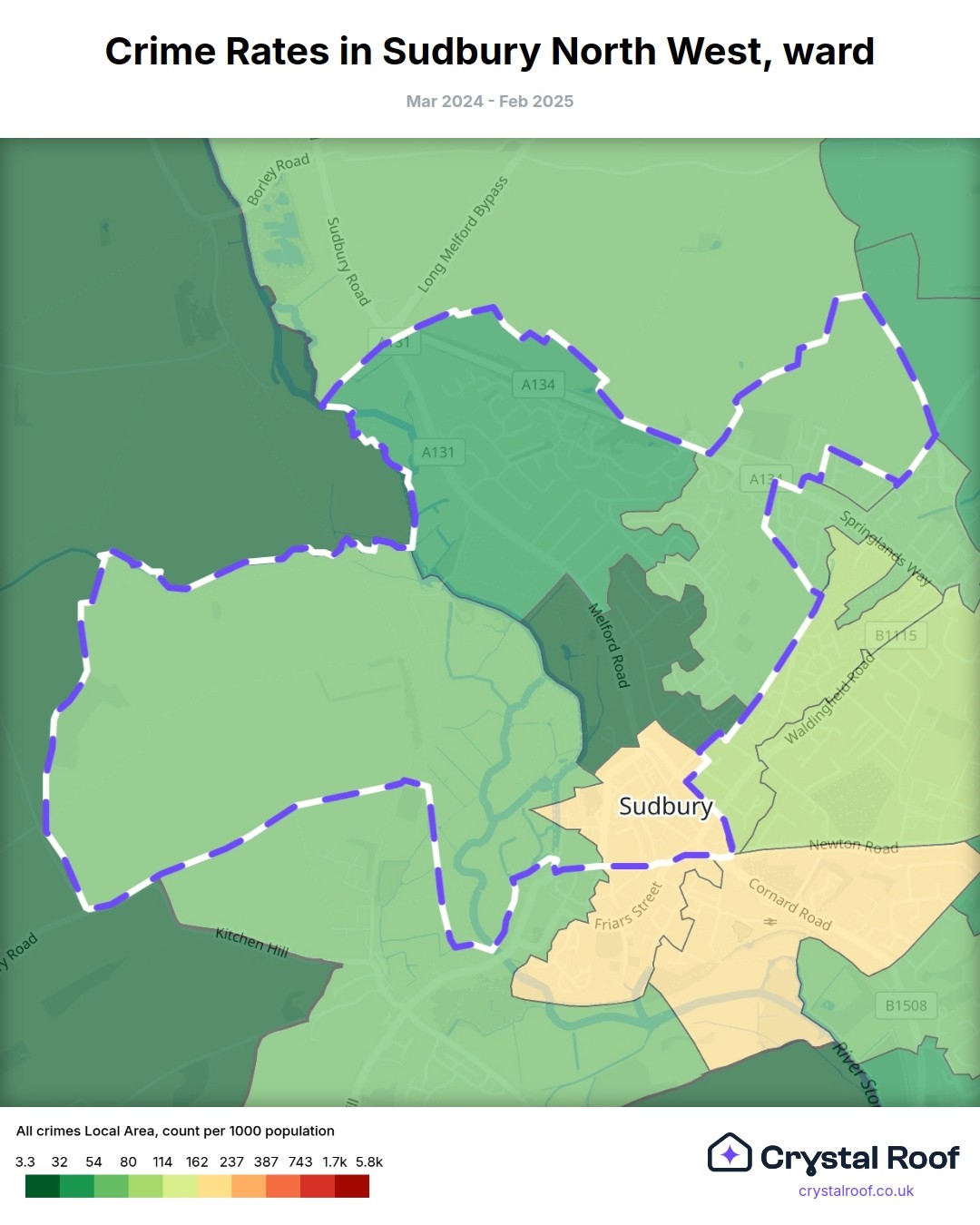 Sudbury North West, (ward) includes areas with the following crime ratings (see map):