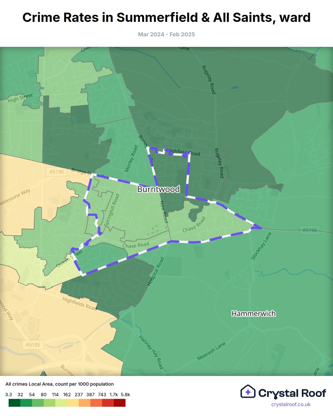 The figures in grey indicate the relative ratings of Summerfield & All Saints (ward) for a specific crime type compared to other wards in England and Wales.