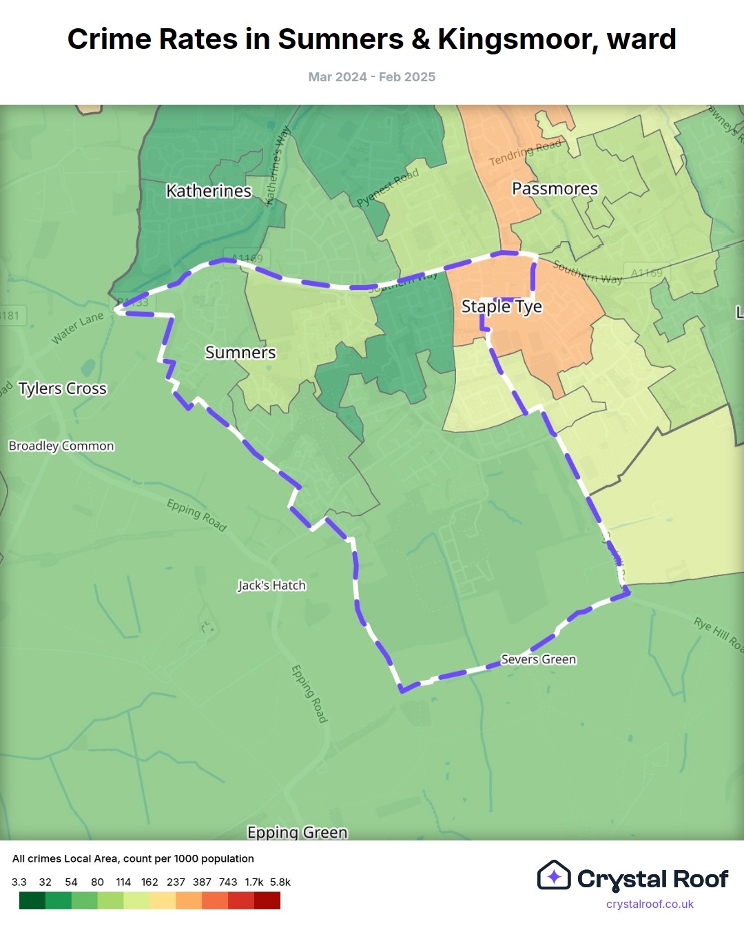 Sumners & Kingsmoor, (ward) includes areas with the following crime ratings (see map):