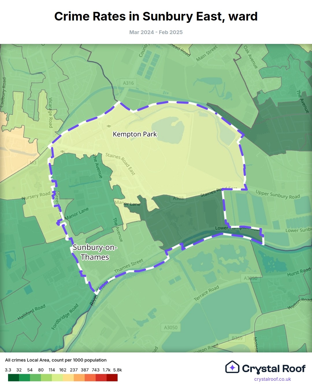 The figures in grey indicate the relative ratings of Sunbury East (ward) for a specific crime type compared to other wards in England and Wales.