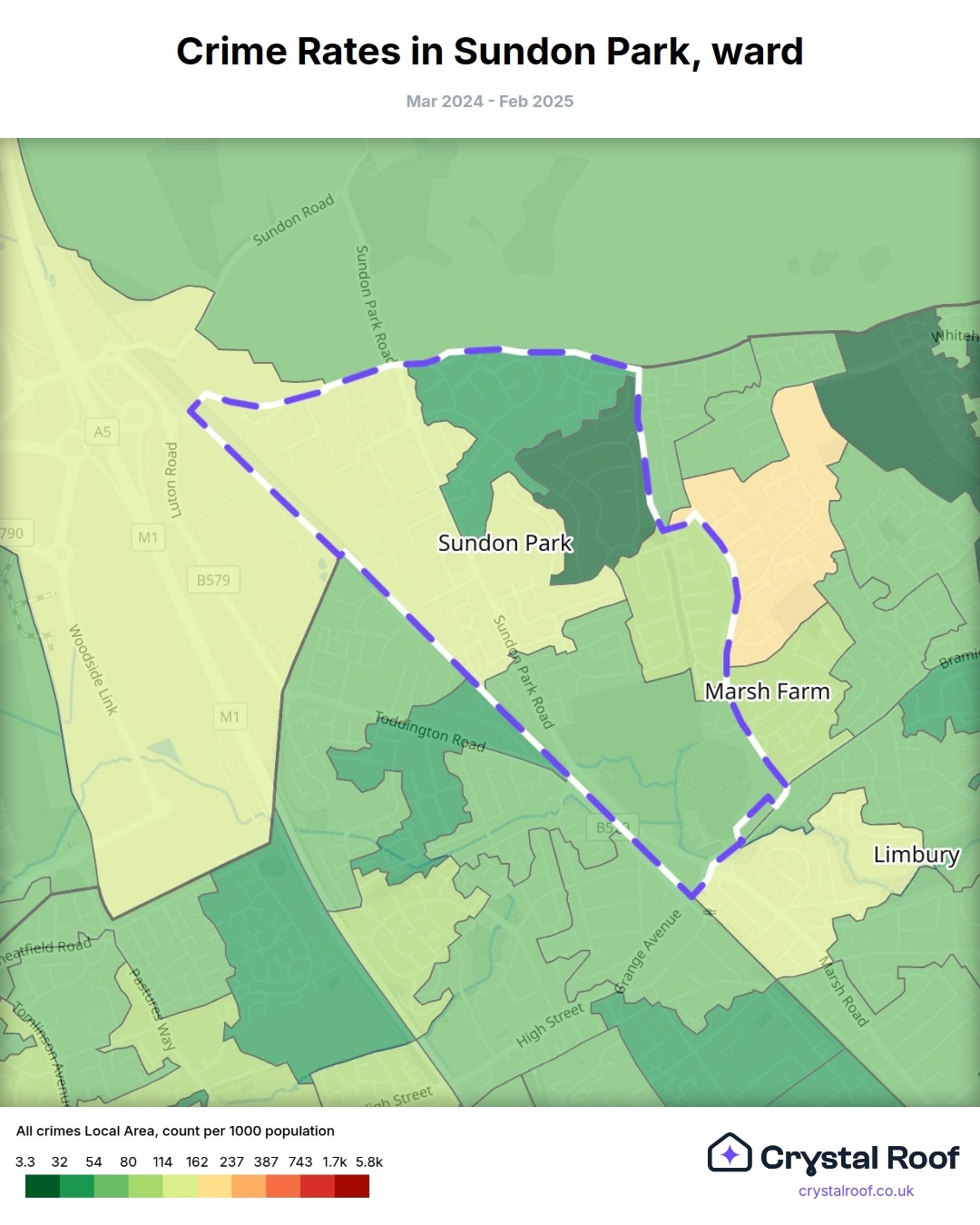 The figures in grey indicate the relative ratings of Sundon Park (ward) for a specific crime type compared to other wards in England and Wales.