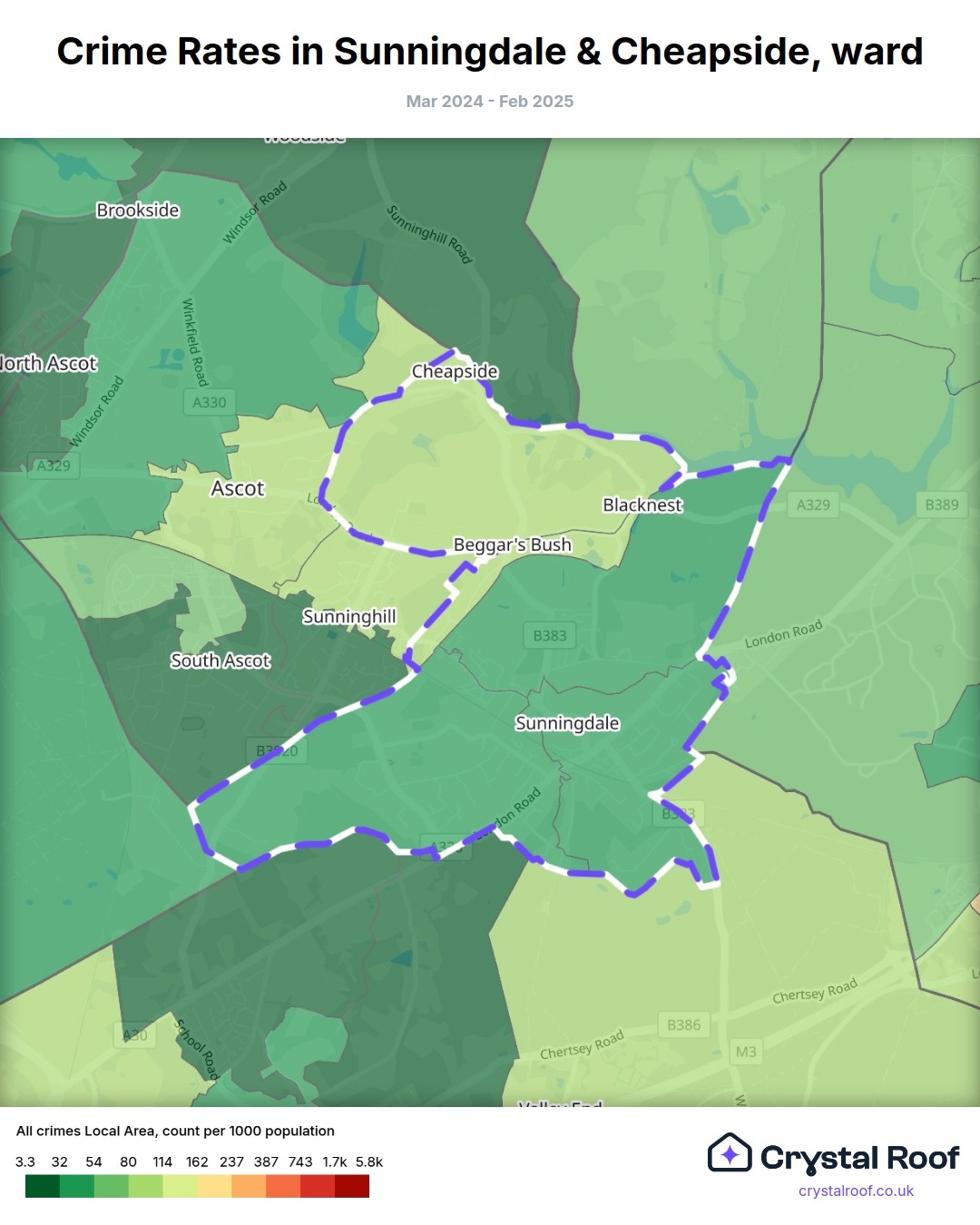 Sunningdale & Cheapside, (ward) includes areas with the following crime ratings (see map):