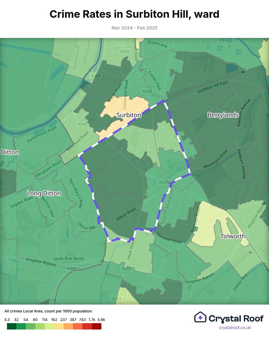 Surbiton Hill, (ward) includes areas with the following crime ratings (see map):