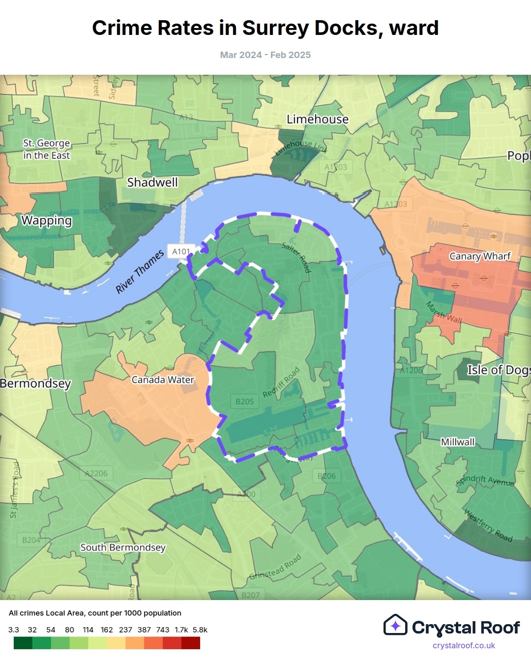 Surrey Docks, (ward) includes areas with the following crime ratings (see map):
