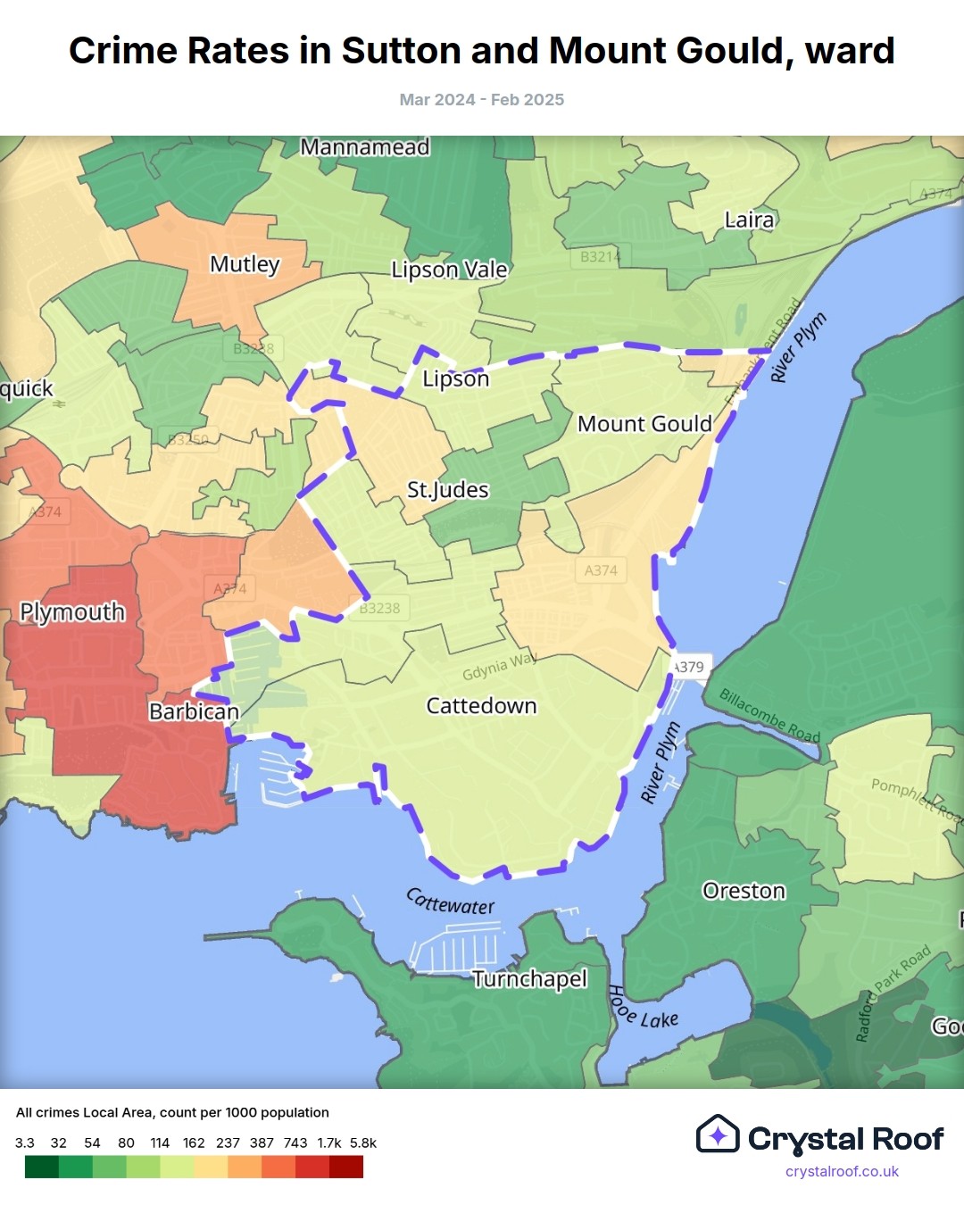 Sutton and Mount Gould, (ward) includes areas with the following crime ratings (see map):