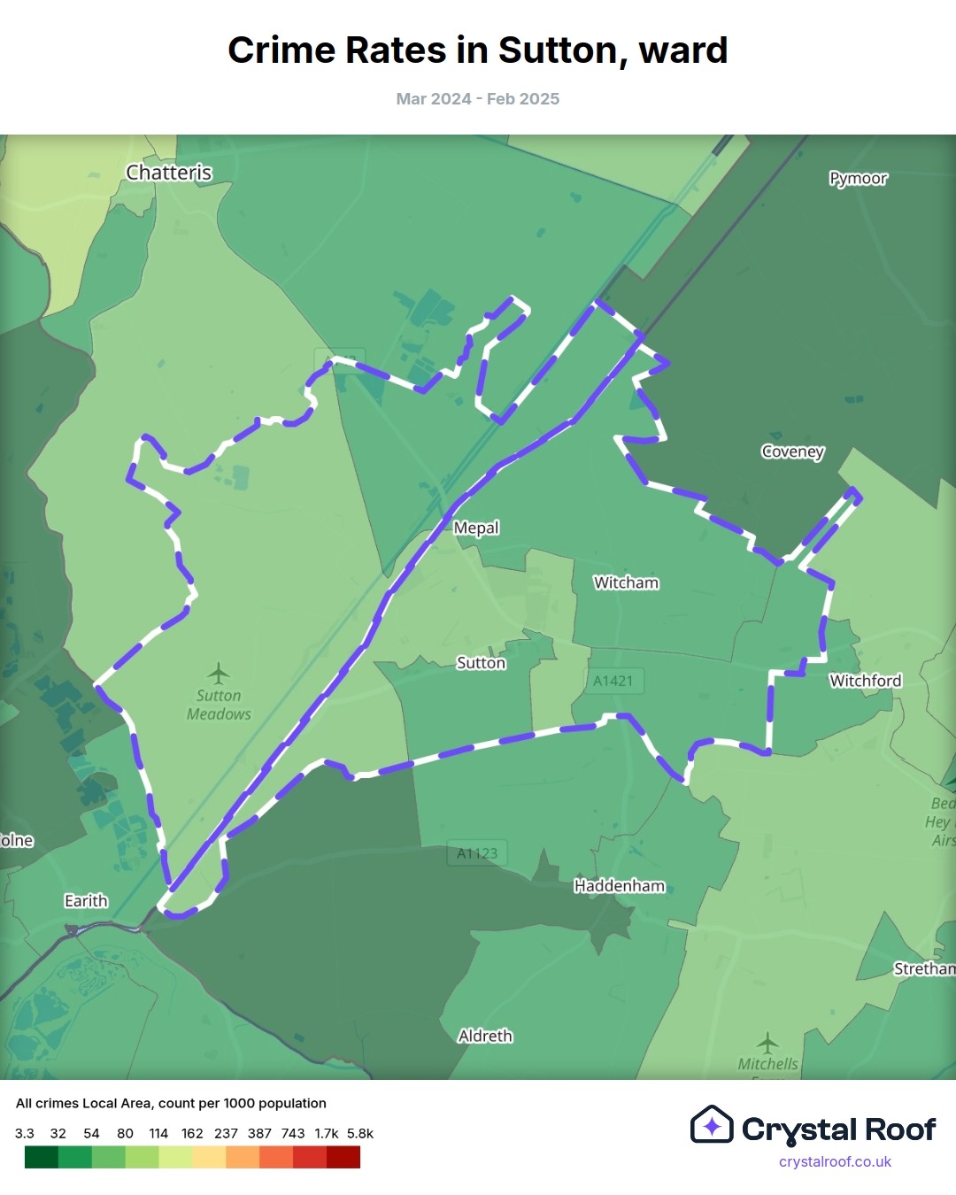 Sutton (ward) is located within East Cambridgeshire (borough). Annual total crime rate in East Cambridgeshire (borough) is 58.5 crimes per thousand resident population, which can be rated as 2 out of 10 or low crime level compared to other local authority districts in England and Wales.