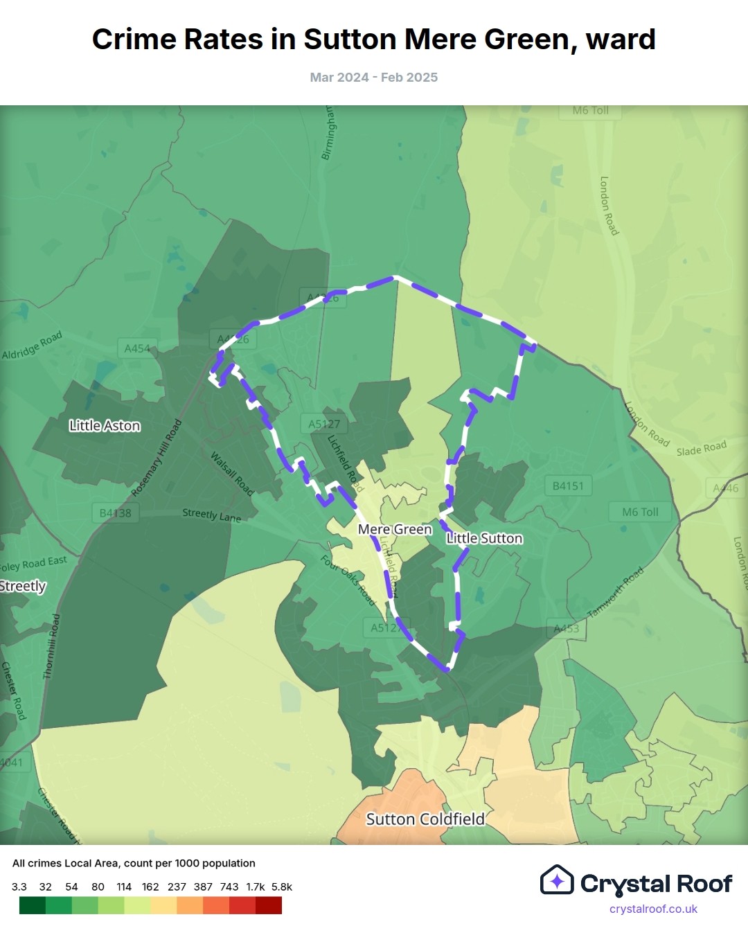 The figures in grey indicate the relative ratings of Sutton Mere Green (ward) for a specific crime type compared to other wards in England and Wales.