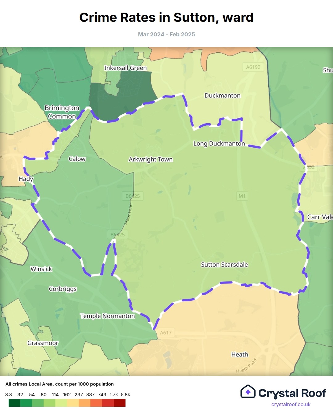 Sutton (ward) is located within North East Derbyshire (borough). Annual total crime rate in North East Derbyshire (borough) is 68.5 crimes per thousand resident population, which can be rated as 2 out of 10 or low crime level compared to other local authority districts in England and Wales.