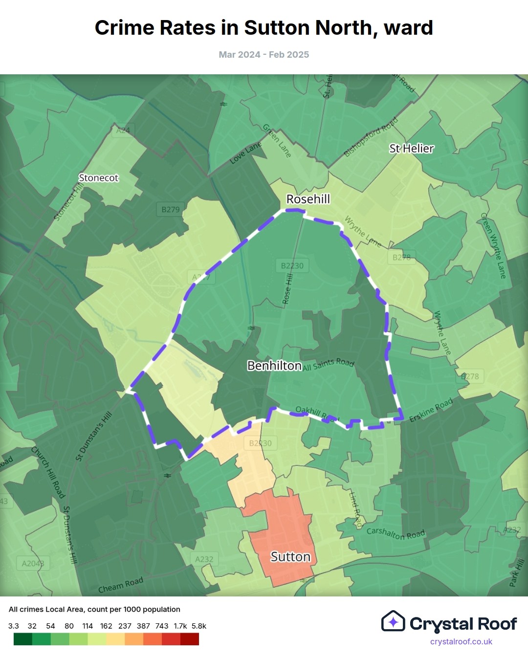 The figures in grey indicate the relative ratings of Sutton North (ward) for a specific crime type compared to other wards in England and Wales.