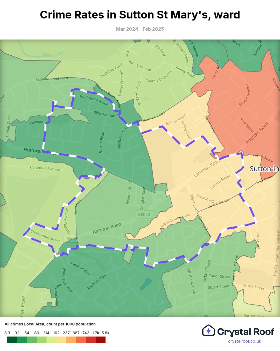 Sutton St Mary's, (ward) includes areas with the following crime ratings (see map):