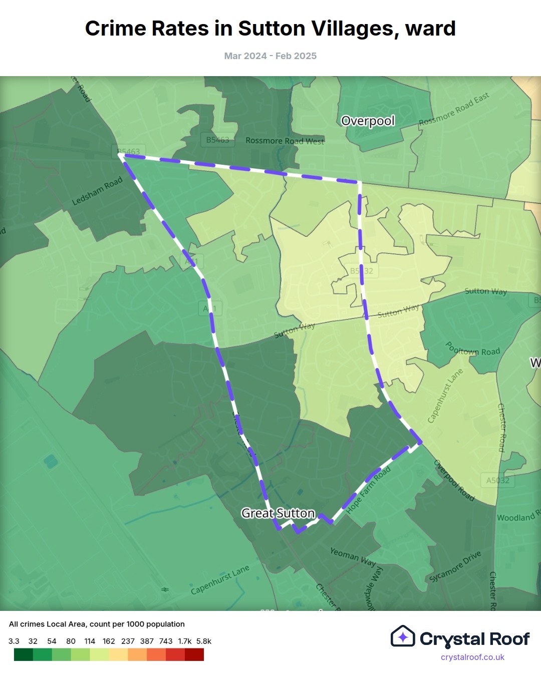 Sutton Villages (ward) is located within Cheshire West and Chester (borough). Annual total crime rate in Cheshire West and Chester (borough) is 69.3 crimes per thousand resident population, which can be rated as 2 out of 10 or low crime level compared to other local authority districts in England and Wales.