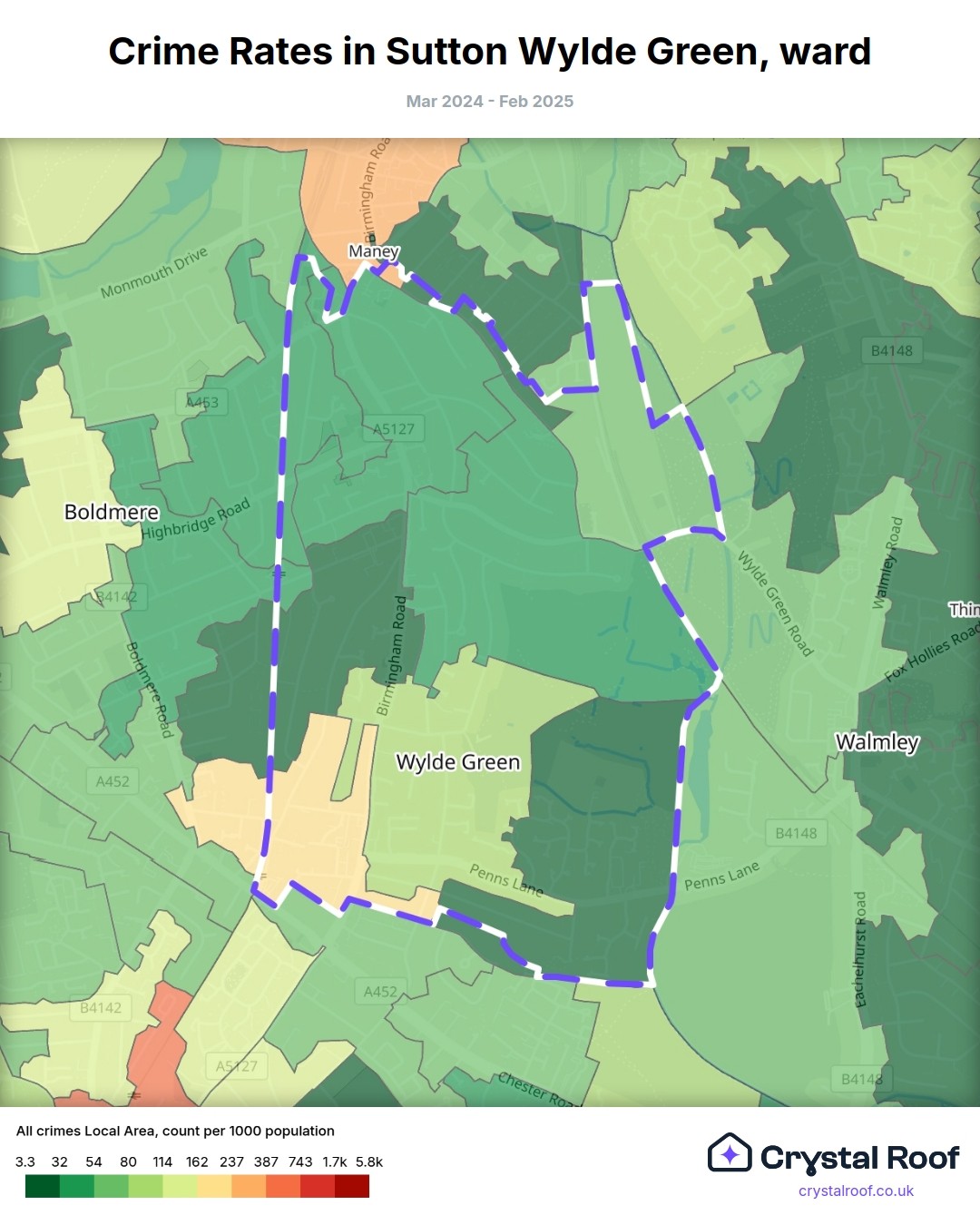 Sutton Wylde Green, (ward) includes areas with the following crime ratings (see map):